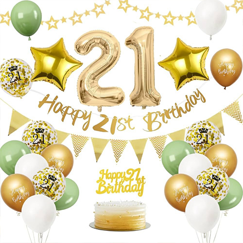 21. õhupallikomplekt: see 21. õhupallikomplekt koosneb lateksõhupallidest, fooliumist õhupallidest, sünnipäevalippudest ja muudest tarvikutest. Seda on lihtne kokku panna ja see võib muuta teie 21. sünnipäeva pidulikumaks. Selline kvaliteetne ja vapustav seade aitab teil 21. sünnipäeva õhtut heledamaks muuta ja muuta selle väärtuslikuks hetkeks, mida teie tütar, teie ise ja kogu pere ei unusta kunagi.