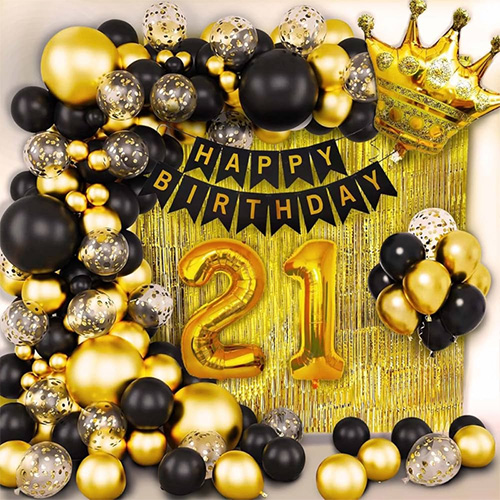 21. õhupalli vaniku kaare komplekt: selle 21. õhupalli vaniku kaare komplekti põhivärvid on must, kuld, hõbe jne, mis sobib väga hästi meeste ja naiste kaunistamiseks 21. sünnipäeva peol. Neid saab riputada uksele või seinale ning sobivad väga hästi ka sise- ja välistingimustes kasutamiseks, et luua omanäoline 21. sünnipäevapidu meestele või naistele.