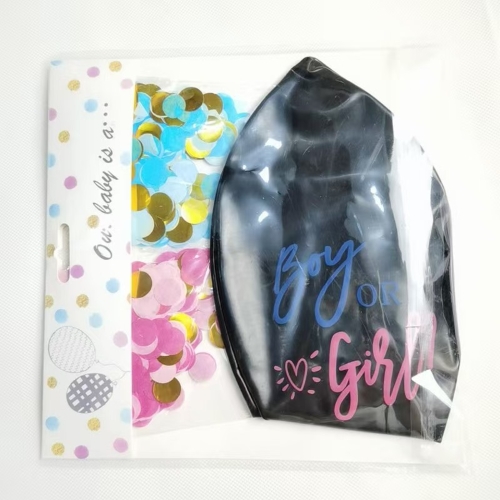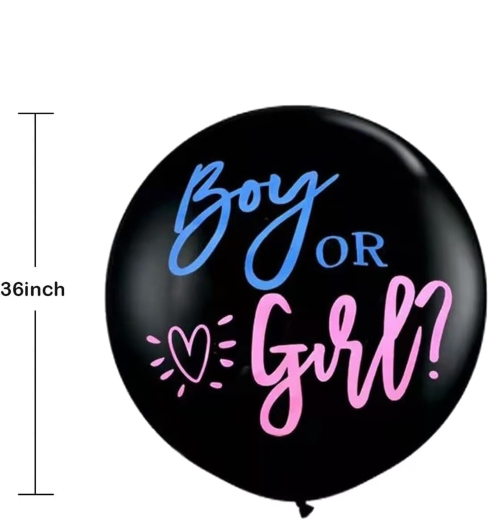 jaoks36-tolline soo paljastamise õhupalllaos on see mattmust ja sellel on palju printimisstiile, näiteks poisi või tüdruku, poisi ja tüdruku tegelaskuju või midagi muud, mis on seotud poisi ja tüdrukuga. Konfettide jaoks on üks kott roosa paberist konfettid fooliumi kullavärvi konfettidega, teine kott on sinine paberist konfettid fooliumi kullavärvi konfettidega.