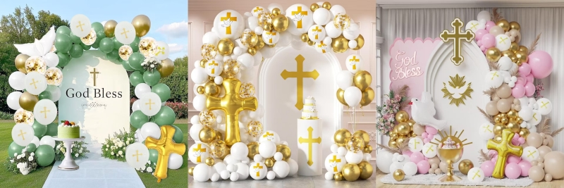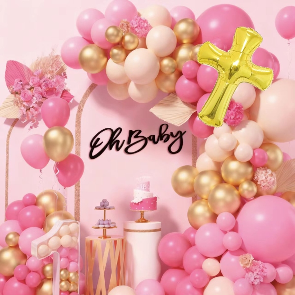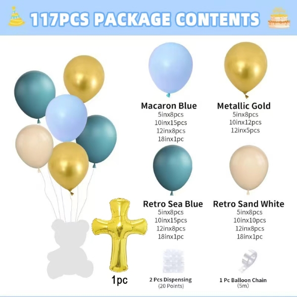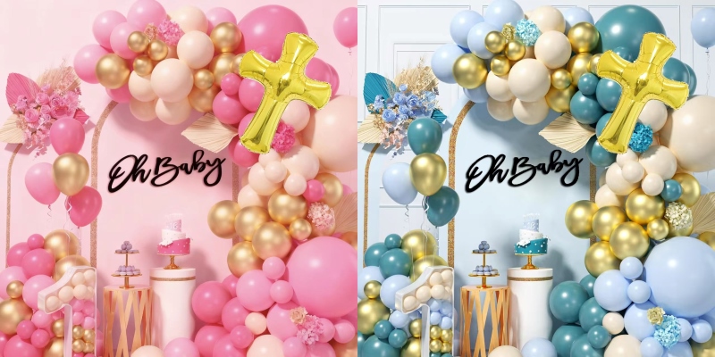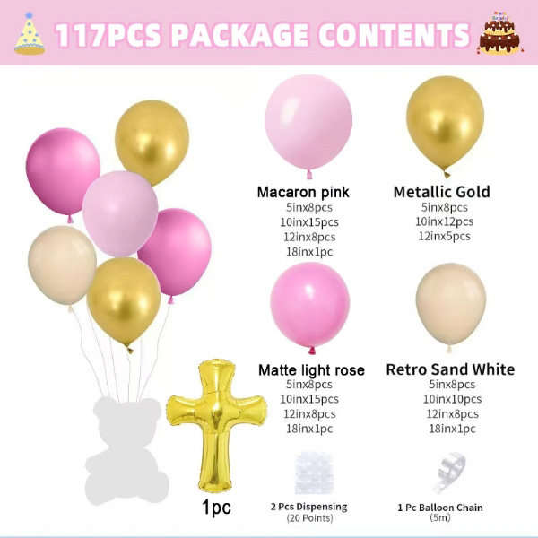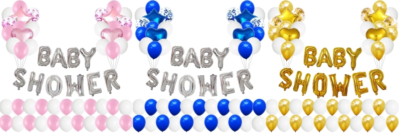 Baby shower balloonkaare komplektidel on kaks stiili, üks stiil on mõeldud beebitüdrukutele ja üks stiil on mõeldud beebipoistele. Beebitüdruku komplekt on valmistatud makaronroosa värvi õhupallist, matist heledat roosi värvi õhupallist, matist heledat nahavärvi õhupallist, metallist kuldset värvi õhupallist ja kuldsest jumala õnnistab ristist. Beebipoiste komplekt on valmistatud makaronsinist värvi õhupallist, retro meresinist värvi õhupallist, matist heledat nahavärvi õhupallist, metallist kuldset värvi õhupallist ja kuldsest jumala õnnistab ristist. Mõlemal on liimitäpp ja õhupallireis, neist saab teha terve ilusa vaniku.
