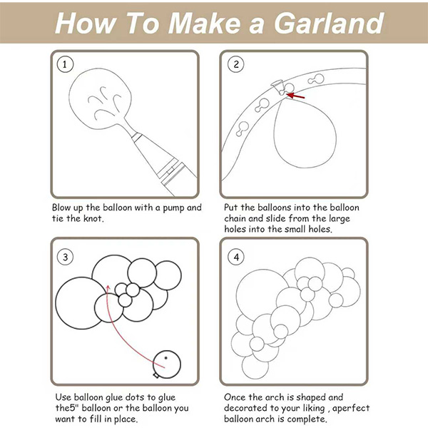 Tähelepanu ja hoiatus:ÄRGE täitke õhupalle üle ning vältige ka päikesepõletust, ülekuumenemist, teravat esemeid ja liigset hõõrdumist. Kontrollige igasse õhupalli pumbatava õhu hulka, et saavutada oma ideaalne õhupalli suurus, nautige oma Balloon Garland Arch komplektide pidu.