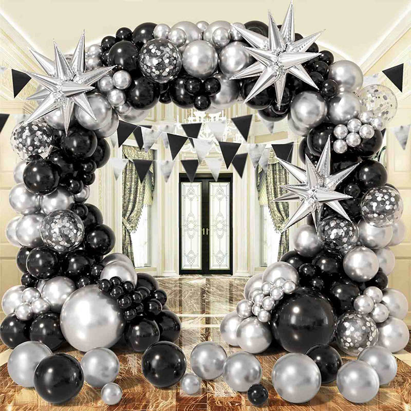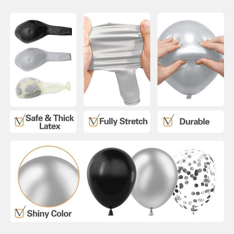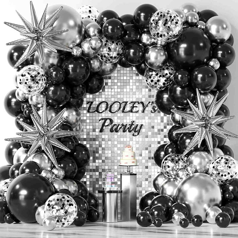 4. Privaatsed ja eksklusiivsed kohandatud mustade ja hõbedaste õhupallide vanikukomplektid.