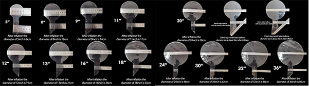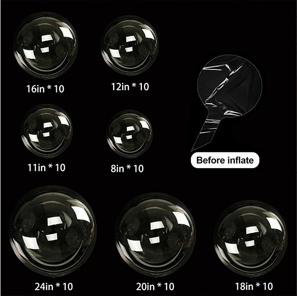 Läbipaistvad bobo õhupallid on saadaval erinevates suurustes, siin loetletud. Erinevad suurused vastavad erinevatele mudelitele ja nende üldistele täispuhutud mõõtmetele. Saate oma suurust vastavalt kohandada.