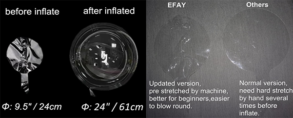 Need laia suuga mullipallid nõuavad käsitsi venitamiseks märkimisväärseid jõupingutusi. Niuni bränd venitab enne saatmist spetsiaalselt õhupalle masina järgi, säästes teie paisumisel aega ja vaeva. Paremate tulemuste ja ümara õhupalli kuju saamiseks soovitame kasutada elektriõhupumpa.