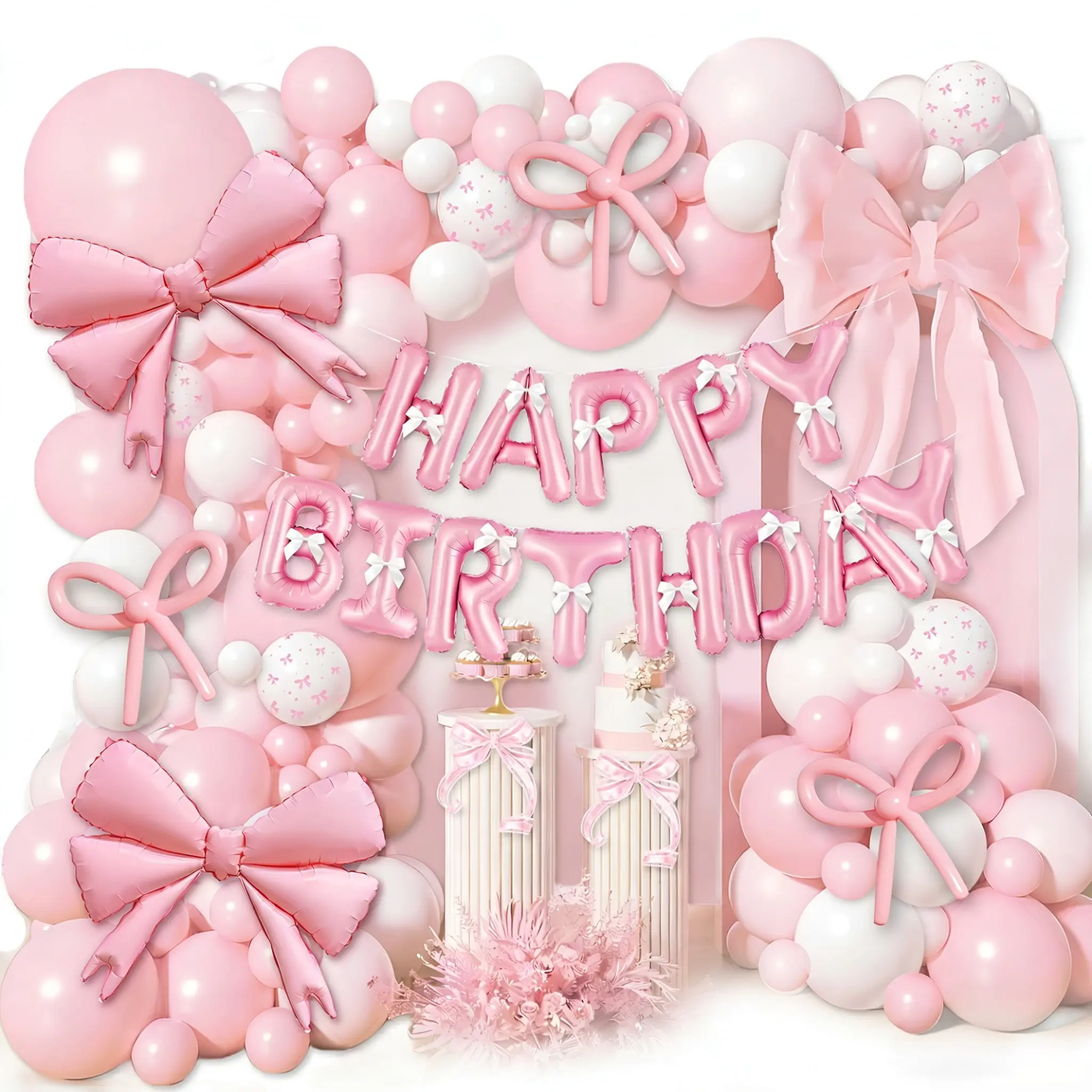 Sellesse komplekti kuuluvad 5-tolline, 10-tolline, 12-tolline ja 18-tolline matt beebiroosa õhupall, 5-tolline, 10-tolline matt valge, fooliumist roosa vibu õhupall, matt beebiroosa 260 pikkune õhupall, lindiga kaar, liimitäpp ja õhupalli kaunistusriba.