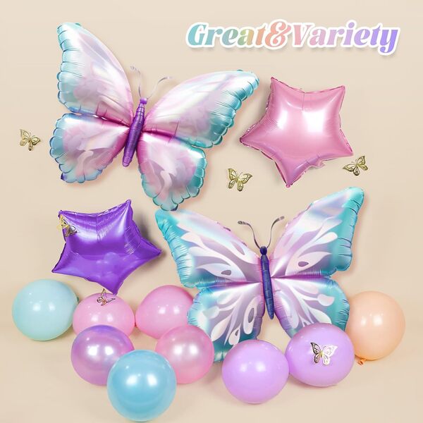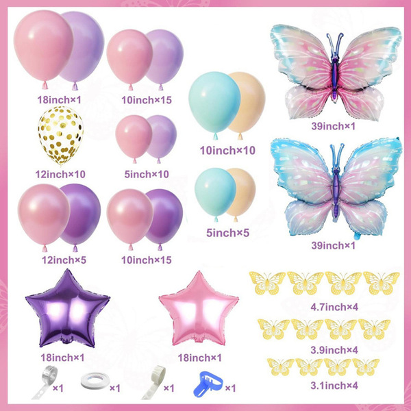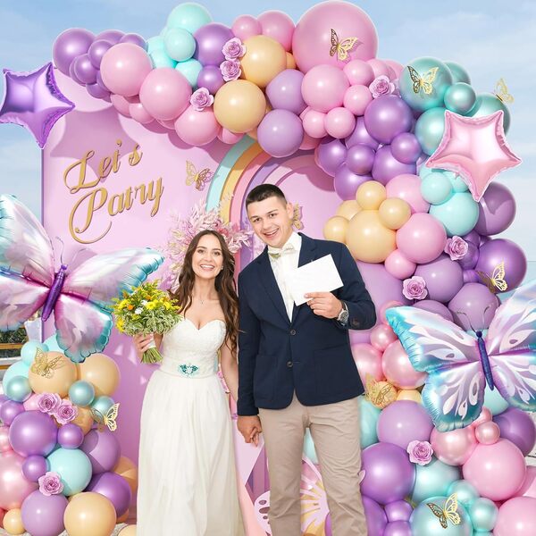 Butterfly õhupallikaare komplekt: Kaarekomplekt on värviline ja pilkupüüdev, koosneb erinevatest fooliumõhupallidest ja lateksõhupallidest. Selle korraldamisel lisage mustrite ja erineva tekstiga taustatahvel ning seejärel ümbritsege õhupallid selle ümber. See on ürituse atmosfääri looja. Selle ees pildistamine näeb väga ilus välja.