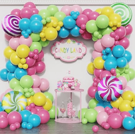 Kommiteemaline õhupallipärjakomplekt, mille põhielementideks on magusate unistuste kommide värv ja armas pulgakommi kuju, üldine stiil on elav ja armas.