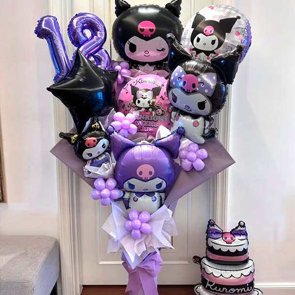 Kuromi on jänesel põhinev koomiksitegelane, kes kannab otsaesisel musta peaga ja roosa kolju logo. Seda armastavad lapsed kogu maailmas. See koomiksi Kuromi fooliumi õhupalli komplekt kasutab sobivaks musta, lilla ja roosa, mis lõi Kuromi klassikaliste värvidega salapärase ja armsa atmosfääri. Komplekt sisaldab erineva kujuga fooliumipallid, sealhulgas koomiksi Kuromi suure peaga õhupall, 18-tolline tärnifooliumi õhupall ja 18-tollise ümmarguse fooliumi õhupall, mis on trükitud Kuromi mustriga. See pakettide komplekt on väike ja peen, sobib väikeste laste sünnipäevapidudeks, Kulomi teema sünnipäevapidudeks, mitte ainult silmapaistvate visuaalefektide jaoks, vaid sellel on ka hea paindlikkus ja vastupidavus, mida pole kerge kahjustada.