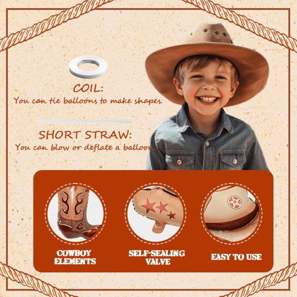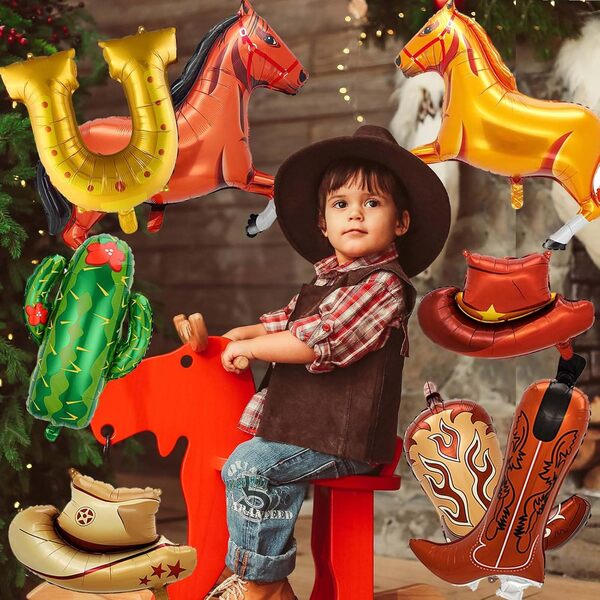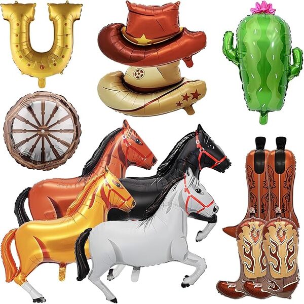 Saadaval erineva kujundusega, alates armsatest mütsidest ja saabastest kuni mänguliste hobuste, hobuseraudade ja elutruu kaktusteni: need tooted sobivad suurepäraselt temaatilisteks pidudeks, filmiõhtuteks, sünnipäevadeks ja kõikvõimalikeks pidulikeks sündmusteks.Kauboi fooliumist õhupallidon valmistatud spetsiaalselt disainitud kvaliteetsest komposiitkilest. See on vastupidav ja tõenäoliselt ei plahvata. Samuti saate seda pärast õiget ladustamist mitu korda uuesti kasutada. Need on erksavärvilised ja neil on suurepärane väljendusjõud. Saate neid kasutada mitmesuguste kombinatsioonide loomiseks. Kauboi fooliumõhupallide vanikukomplekti valmistamiseks kasutage näiteks 5–10 tk fooliumist õhupalle (hobuse stiilid, mütsitüübid, saapad...) ja 60 tk pruuni, valget, musta värvi lateksist õhupalli ja muid tarvikuid (taust, bännerid..). See võib teie peole lisada tugeva ameerika lääneliku maitse, võimaldades teil end tunda, nagu oleksite ise kauboi. Saate seda kasutada sünnipäevadel, pühadel või üritustel. Kui olete läänelike filmide fänn, sobib see teema teile suurepäraselt. Saadaval on hulgiostmiseks mõeldud kauboifooliumist peoõhupallid, mis aitavad teil kulusid vähendada ja edasimüügikasumit suurendada, muutes need parimaks valikuks nii ürituste planeerijate, peotarvete kaupluste kui ka edasimüüjate jaoks.