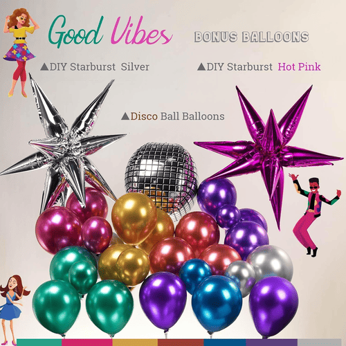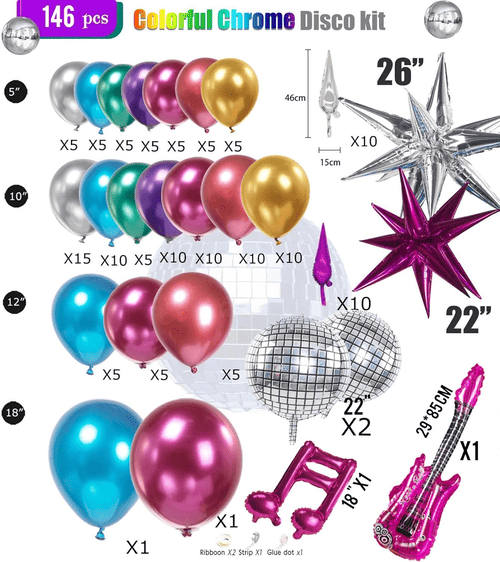 Thedisko õhupalli kaare komplektkoosneb peamiseltvärvilised lateksist õhupallid jamitmesugused fooliumist õhupallid. Särava kroomi stiili kujundamiseks on meie poolt pakutavad lateksõhupallid metallist lateksballoonid, mille pinnad on väga kauni metallilise läikega ning nendega on võimalik saavutada suurepäraseid tulemusi nii sise- kui ka välistingimustes. Nende suurused on 5 tolli, 10 tolli, 12 tolli ja 18 tolli.