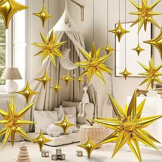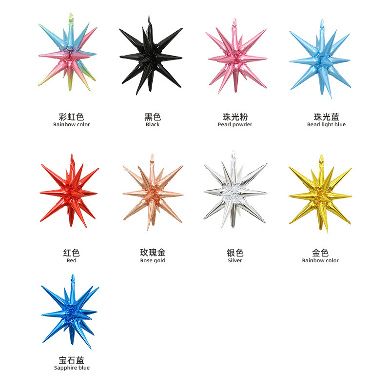 Üheosa plahvatavad tähefooliumi õhupallid: saadaval kahes suuruses: 22 tolli ja 27 tolli. 22-tolline suurus on väiksem ja sobib magamistubade ja kontorite jaoks, muutes selle ideaalseks sünnipäevakaunistamiseks. 27-tolline suurus sobib paremini suurematele ruumidele, näiteks banketisaalidele ja kaubanduskeskuse akendele. Isegi kui see on kõrgele riputatud, võib mustrit selgelt näha.