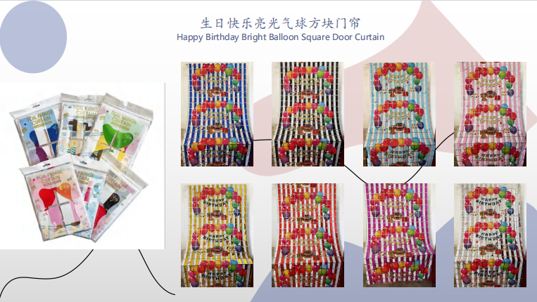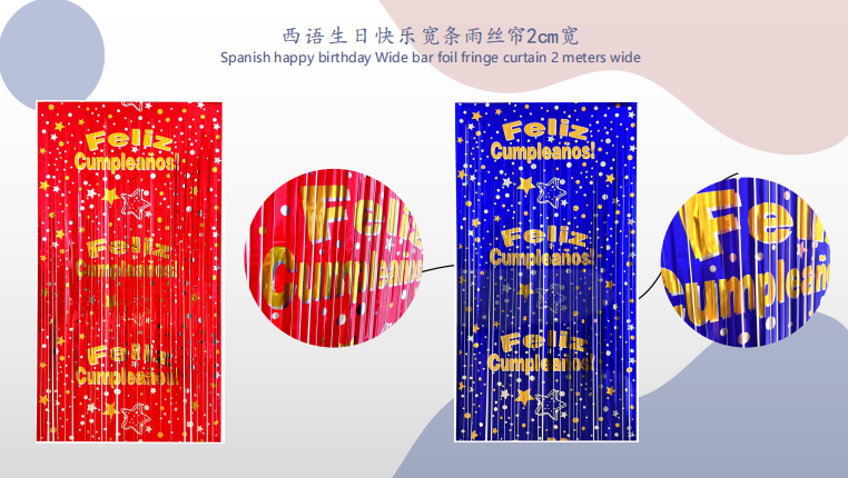 näiteks fooliumkardin koos riigilipu värvi teemaga, mida saab kasutada isamaaliseks tegevuseks, näiteks riiklikul päeval; Seal on ka võidusõiduteemaga mustvalge fooliumi kardin, mis sobivad võidusõiduteemade pidudeks jne.
