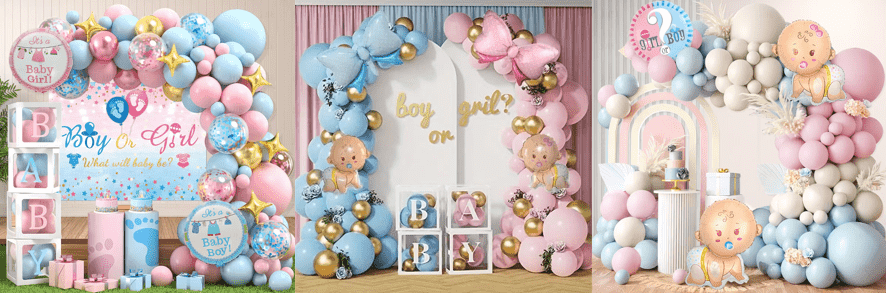Põhiline õhupallide komplekt on peamiselt sobitatud kahe peamise roosa ja sinise värviga ning kaunistuseks lisatakse sama värvi litrite õhupallid ja tähed.