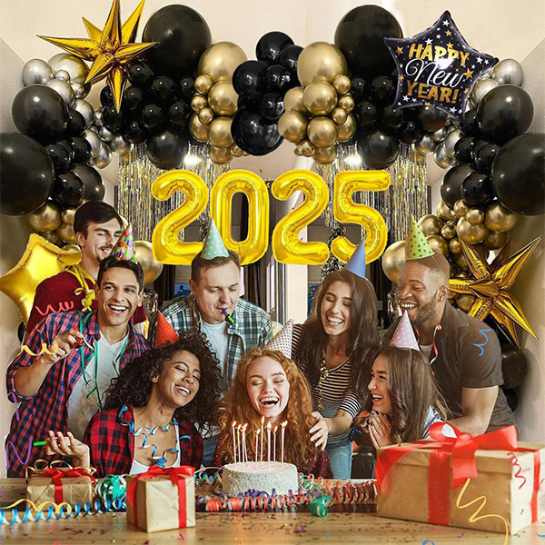 Selle uusaastateemalise komplekti põhivärvid on must ja kuld. Black and Gold Balloon Garland Kit, mis sobib ideaalselt uusaastapidudeks, karnevalideks, pühade koosviibimisteks või muudeks temaatilisteks pidudeks, on must-kuldse õhupalli vanikukomplekt, mis on kohustuslik. Kui see on kokku pandud, näeb see teie peol vapustav välja, lisades mitte ainult piduliku hõngu, vaid ka ataustaks fotode tegemiseks sõprade ja perega, lisades teie uusaasta sisekujundusele lõbusust ja pidulikku meeleolu.