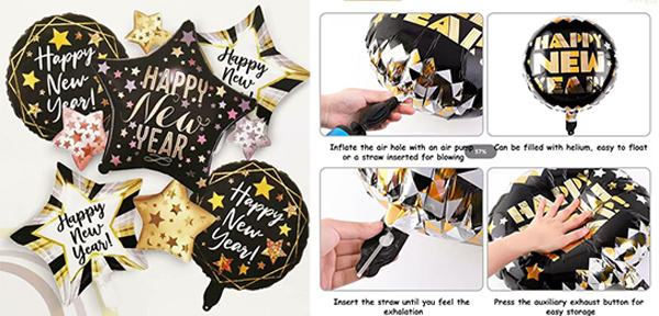 Kõik Happy New Year fooliumõhupallid on heeliumitoega ja korduvkasutatavad: õhupallikomplekt on heeliumitoega ja sobib suurepäraselt aastavahetuse kaunistuste taustaks. Pärast täitmist pigistage lihtsalt mülarfooliumist uusaasta õhupalli ava ja liim sulgub automaatselt. Seda on lihtne puhuda ja tihendada, seda on lihtne täis pumbata ja tühjendada ning see võib pikka aega hõljuda. Saate need asetada ukseavadele või lagedele ja seintele.