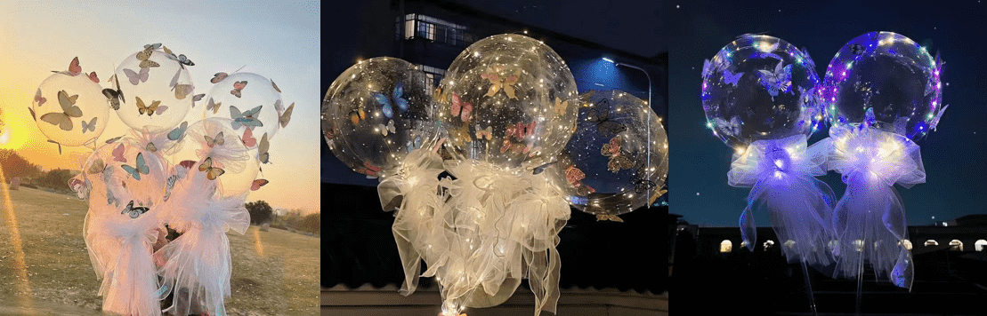 Bobo Balloon ise on läbipaistev ja lihtne, mis on väga kooskõlas õõnsa liblikakleebise kerget käikuva paindlikkusega. Kleebise põhiline kasutamine on uuendada monotoonset õhupalli liblikatantsuvedrustuse palli ja muuta õhupall stseeni fookuseks liblika kolmemõõtmelise kuju ning valguse ja varjuefekti kaudu. Laste sünnipäevapidu, täiskasvanute sünnipäevapidu, pulmade tervituspiirkond, kaubanduskeskuse tegevused, puhkusekodu kaunistamine on väga sobivad. Öösel saab seda sobitada ka LED-tuledega, mis on väga pilkupüüdev.