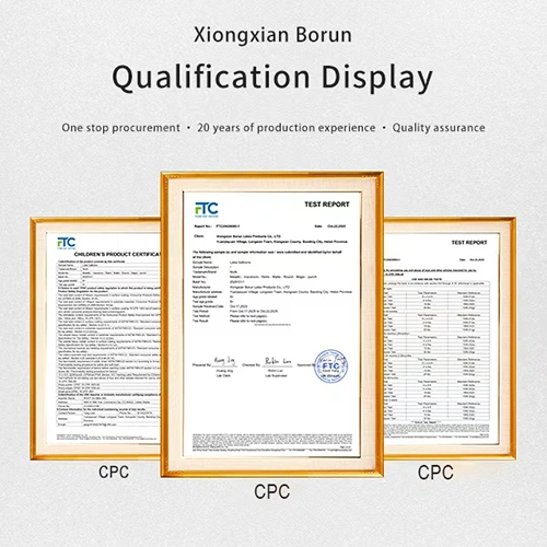 ASTM F963 (USA mänguasjade ohutuse standard):Tagab, et toode vastab USA turu mittetoksilisuse nõuetele ning sobib lastele ja siseruumides kasutamiseks. See sertifikaat on Amazoni ja USA turu jaoks kohustuslik. Kui ostate meilt õhupalle hulgimüügist, anname teile loa sertifikaadi kasutamiseks.