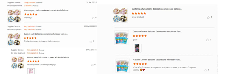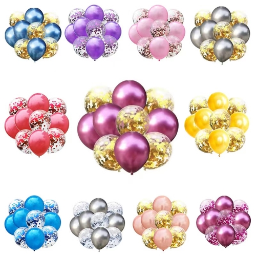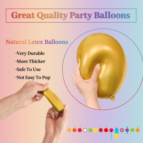 Pakendi jaoks saate valida ühe metallikvärvi. Populaarsed valikud on šampanjakuld, metallikroheline, roosakuld ja nii edasi. See muudab teie stseeni lihtsaks ja kokkupandavaks. See venib tõesti hästi. See ei hüppa peaaegu kunagi. Pärast täitmist püsib see täis üle 12 tunni. Samuti saab segada erinevaid metalliktoone. Proovige kulda ja hõbedat koos. See loob kihilise, pilkupüüdva sisekujunduse. Ühendage need õhupallid ka konfetti lateksõhupallidega. Metallist õhupallide sujuv läige on kontrastiks konfeti õhupallide sädeleva tekstuuriga. Konfetid liiguvad sees ringi, kui neid raputada. See lisab igasse ruumi lõbusust ja liikumist. Metallist värvi õhupallide väikesed komplektid sobivad sünnipäevapidude, pulmade, pühadeürituste ja poeakende jaoks. Iga komplekt läbib ranged õhutiheduse ja ohutuse testid. See vastab rahvusvahelistele standarditele nagu EN71 ja CE. Nende täispuhumine on lihtne. Isegi DIY algajad saavad neid kasutada. Neid armastavad ka professionaalsed ürituste planeerijad. Loote hämmastava atmosfääriga ruumi.