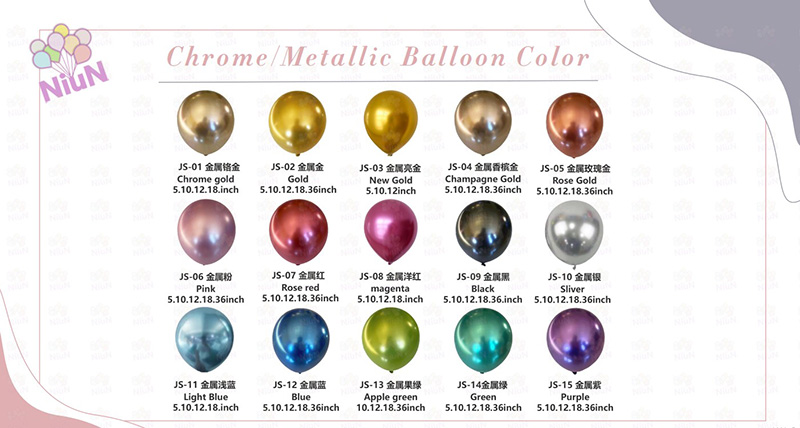 Kasutame oma metallist õhupallide jaoks imporditud tindiga katmise tehnoloogiat. Värvid on ühtlased ja rikkalikud. Võtke näidetena need, mis on piltidel. Nende hulka kuuluvad metallist šampanjakuld, metallik sinine ja metallik lilla. Need värvid on Euroopa ja Ameerika turgudel populaarsed. Need sobivad paljudel juhtudel. Need sündmused on pulmad, sünnipäevad ja tähtpäevad.