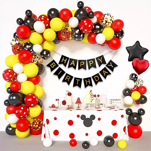 SeeMiki-Hiire õhupallipärga kaaron saadaval peamiselt roosa ja punase seeriana, shlateksist õhupallid, fooliumist õhupallid, sünnipäevapaberist bännerid, fooliumkardinad ja muud aksessuaarid. Kõik selle paketi tarvikud on kvaliteetsed.