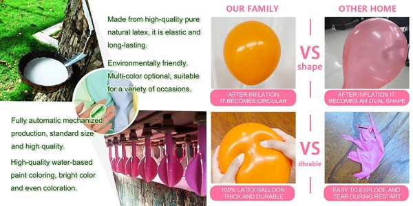 Õhupallide toorained: Valmistatud Kagu-Aasiast imporditud puhtast looduslikust lateksist. Balloons are more flexible, can be blown to larger sizes, are less likely to burst, and can be completely naturally degraded without causing any pollution to the environment.