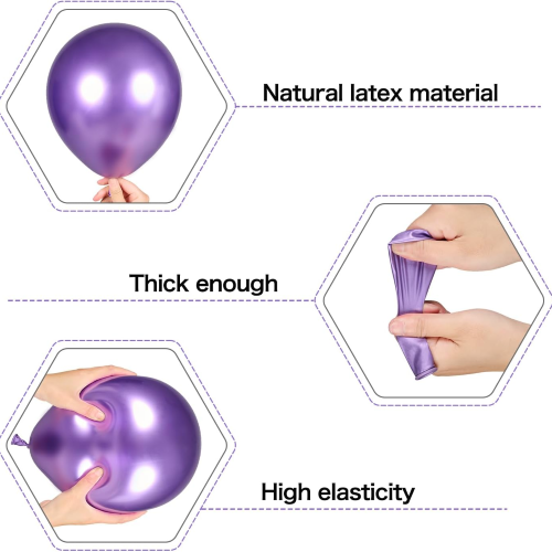 Meie lillade ja mustade õhupallide vanikukomplektide kogus ja kaal on rohkem kui teistel kaubamärkidel. Iga meie õhupallipärga kaare komplekt sisaldab vähemalt 100 õhupalli. Igas meie pakutavas õhupalli suuruses on standardne tööstusharu grammkaal. Näiteks 12-tolliste õhupallide grammkaal on 2,8 g. Kui teil on erinõudeid, saame reguleerida ka õhupalli grammi kaalu. Nagu allolevatelt piltidelt näete, piisab vaid ühest meie õhupallikomplektist, et luua lihtsalt stiilne ja atmosfääriline peostseen.