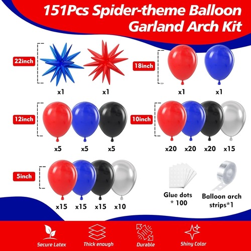 Õhupallikomplekti põhivärvid on sinine, punane ja must. Kolm eristatavat värvi panevad teid ette kujutama filmist pärit Ämblikmehe lahedat figuuri. Selle komplekti lateksõhupallid, sealhulgas mattpunane õhupall, mattsinine õhupall, mattmust õhupall, metallist õhupall. Selle komplekti fooliumõhupall on plahvatustähtedega fooliumballoon, värvus on sinine ja punane.