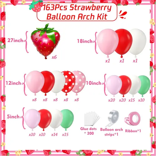 Maasikateemaline õhupalli vanik koosneb kvaliteetsest lateksist ja fooliumist õhupallist. Komplekti kõige silmapaistvam ese on 27-tolline maasikafooliumist õhupall. Lisaks on oluliseks osaks ka selles olevad lateksist õhupallid. Komplektis olevad lateksist õhupallid on erinevat värvi ja erinevat suurust, millega saab luua uhkeid kihte. Lateks õhupalli värvus on macarron roosa, matt punane, matt sügavroosa, retro elevandiluu valge.