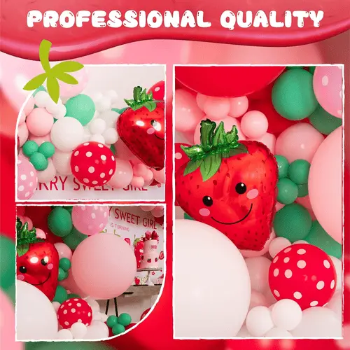 Meie pakutavad maasikateemalise õhupallipärja õhupallid on kvaliteetsed. Meie pakutav lateksist õhupall on valmistatud 100% toorlateksist, mis on imporditud Kagu-Aasiast. Tooraine on täiesti keskkonnasõbralik ja lastele kahjutu. Meie pakutav fooliumballoon on valmistatud tugevast lamineeritud kilest, mida saab pärast korralikku ladustamist uuesti kasutada.