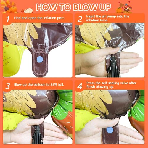 Tänupüha fooliumist õhupalle on väga lihtne täis puhuda ja tihendada. Täitmiseks võite kasutada käsitsi või elektripumpa ja seejärel tihendada isekleepuva liimiga, mis on iga õhupalli düüsi juures. Kui õhupall on suletud, muutub see tugevaks.