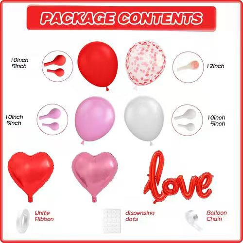 See õhupallide komplekt koosneb peamiseltlateksist õhupallidja mitufooliumist õhupall. Nende lateksist õhupallid on punast, roosat, valget värvi. Need on valmistatud 100% looduslikust lateksist, mis on täiesti keskkonnasõbralik ja inimkehale kahjutu. Ja nende suurus on samuti erinev. Kauni kihi seadmiseks on lateksist õhupallide suurused 5–12 tolli. Komplekti paigutamine on väga lihtne, sellega valmistame ette ka punktliimi ja õhupalliketi. Nii et saate seda korraldades teha seda paindlikult.